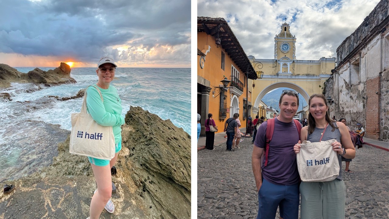 Melanie Cleavelin and her Halff bag traveled to Antigua, Guatemala, sharing a snapshot of the iconic Santa Catalina Arch.